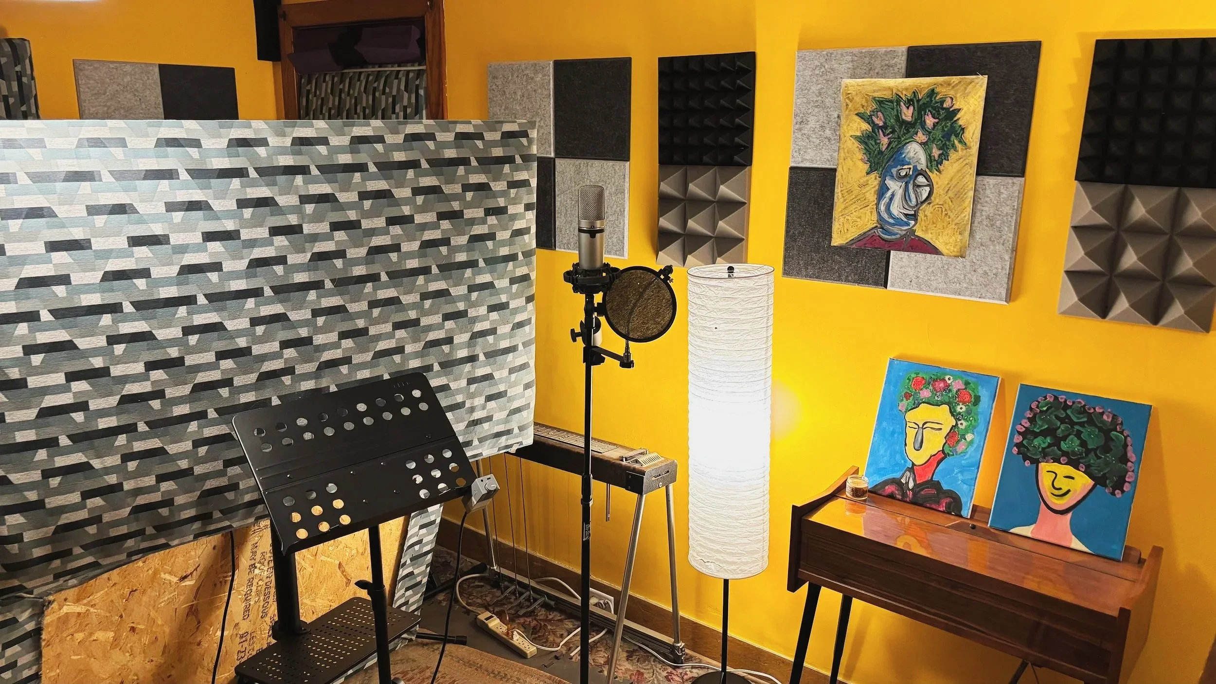 We also have an array of onsite instruments including a vintage Fender Rhodes piano, Moog Little Phatty synth, Korn D1 full octave weighed keyboard, pedal slide steel guitar, various acoustic and electric guitars, accordion, concertina, theremin, and a bunch of percussion options.